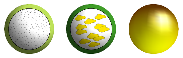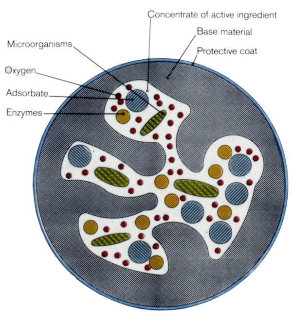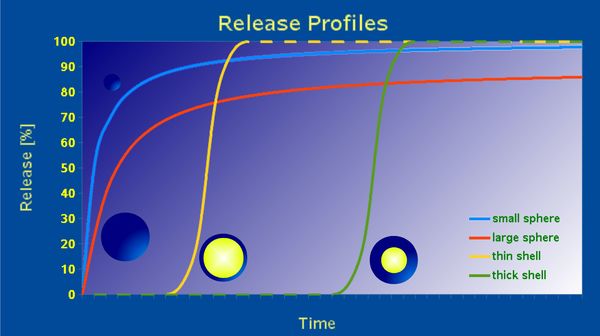 Für Anwendungen, die eine schlagartige Freisetzung oder eine Freisetzung über einen sehr langen Zeitraum erfordern, wird bevorzugt die Kern-Hülle-Verkapselung verwendet. Ein sphärischer Partikel mit einer festen Außenhülle wird generell als Mikrokapsel bezeichnet.